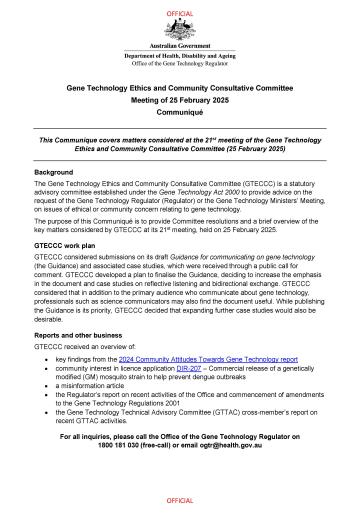 This Communique covers matters considered at the 21st meeting of the Gene Technology Ethics and Community Consultative Committee (25 February 2025).
