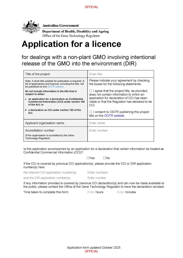 Use this form for applications for a licence for dealings (activities) with a non-plant GMO involving intentional release (DIR) of the GMO into the environment under the Gene Technology Act 2000.