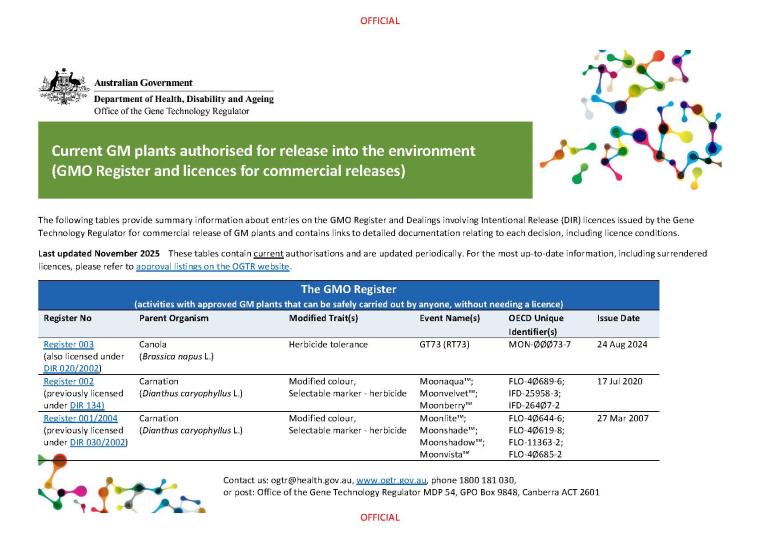 Summary tables about entries on the GMO Register and Dealings involving Intentional Release (DIR) licences issued by the Gene Technology Regulator for commercial release of GM plants. The tables contain OECD unique identifiers and links to detailed documentation relating to each decision, including licence conditions.