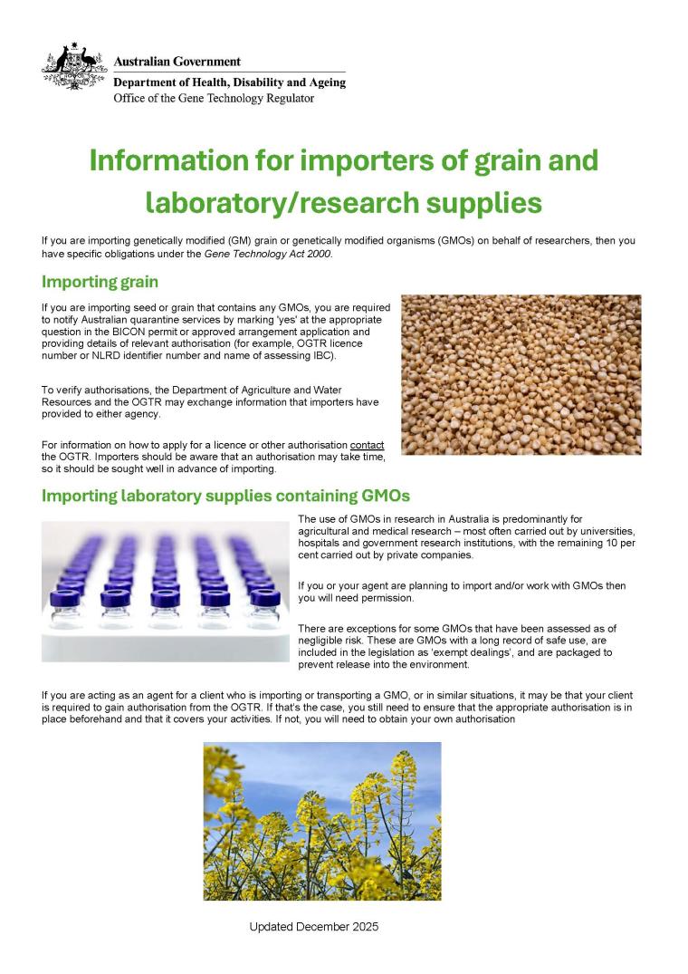 If you are importing genetically modified grain or you are importing genetically modified organisms (GMOs) on behalf of researchers, then you have specific obligations under the Gene Technology Act 2000.
